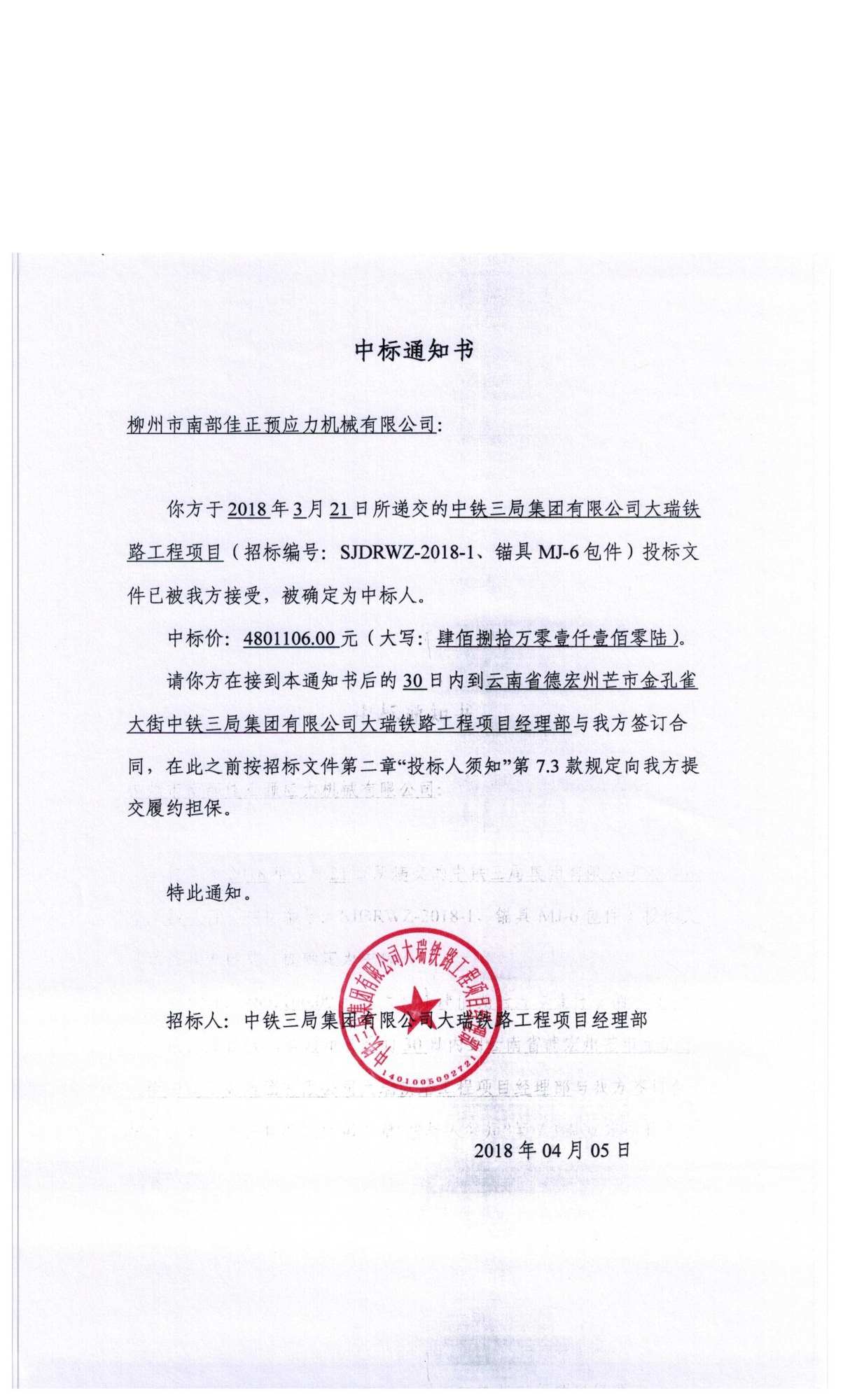 中鐵三局大瑞鐵路錨具中標(biāo)通知書